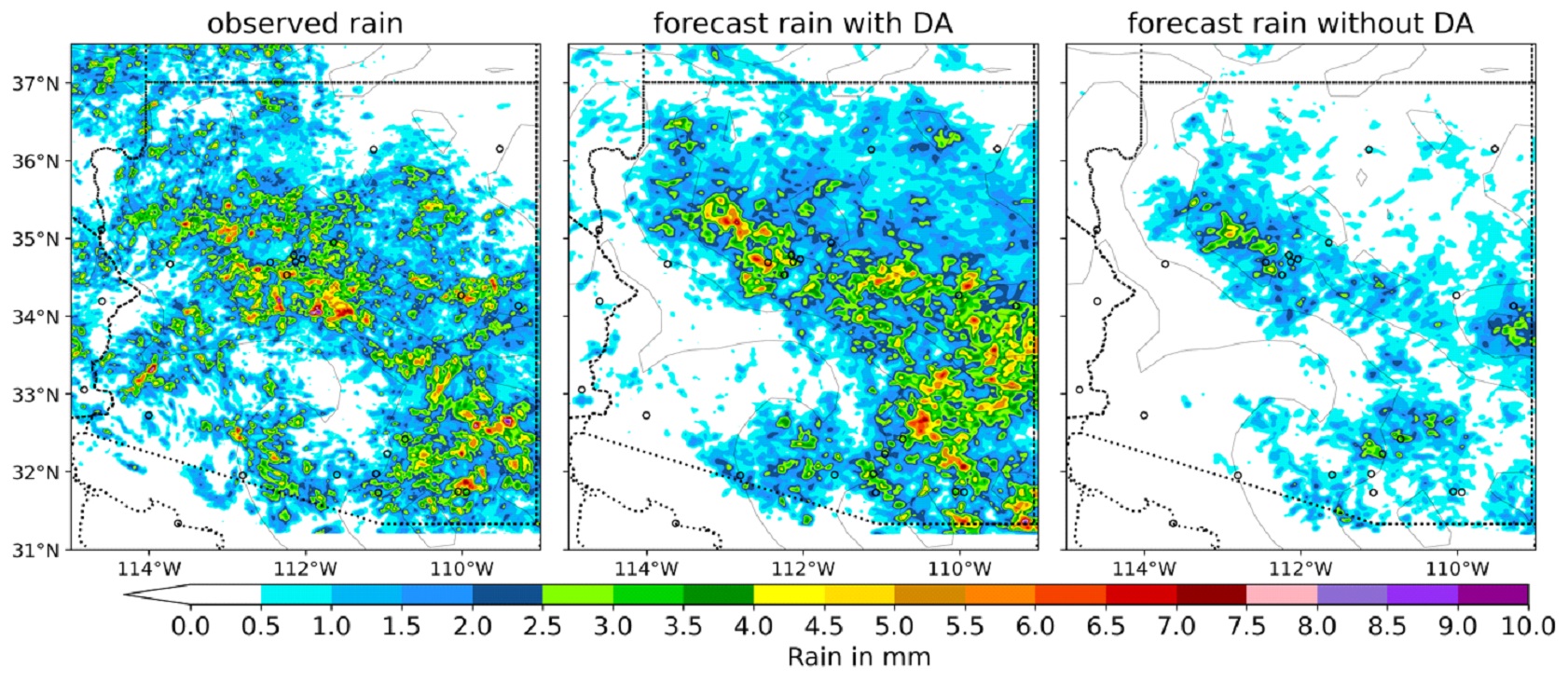Precipitazioni osservate (a sinistra), precipitazioni previste con assimilazione dei dati (DA) (al centro) e precipitazioni previste senza assimilazione dei dati (a destra) sul territorio dell’Arizona. Si noti che il modello accoppiato con l’assimilazione dei dati migliora la previsione delle precipitazioni. In assenza di assimilazione dei dati, il modello prevede precipitazioni molto scarse. (Da un lavoro di Risanto et al. attualmente sottoposto a revisione paritaria).
